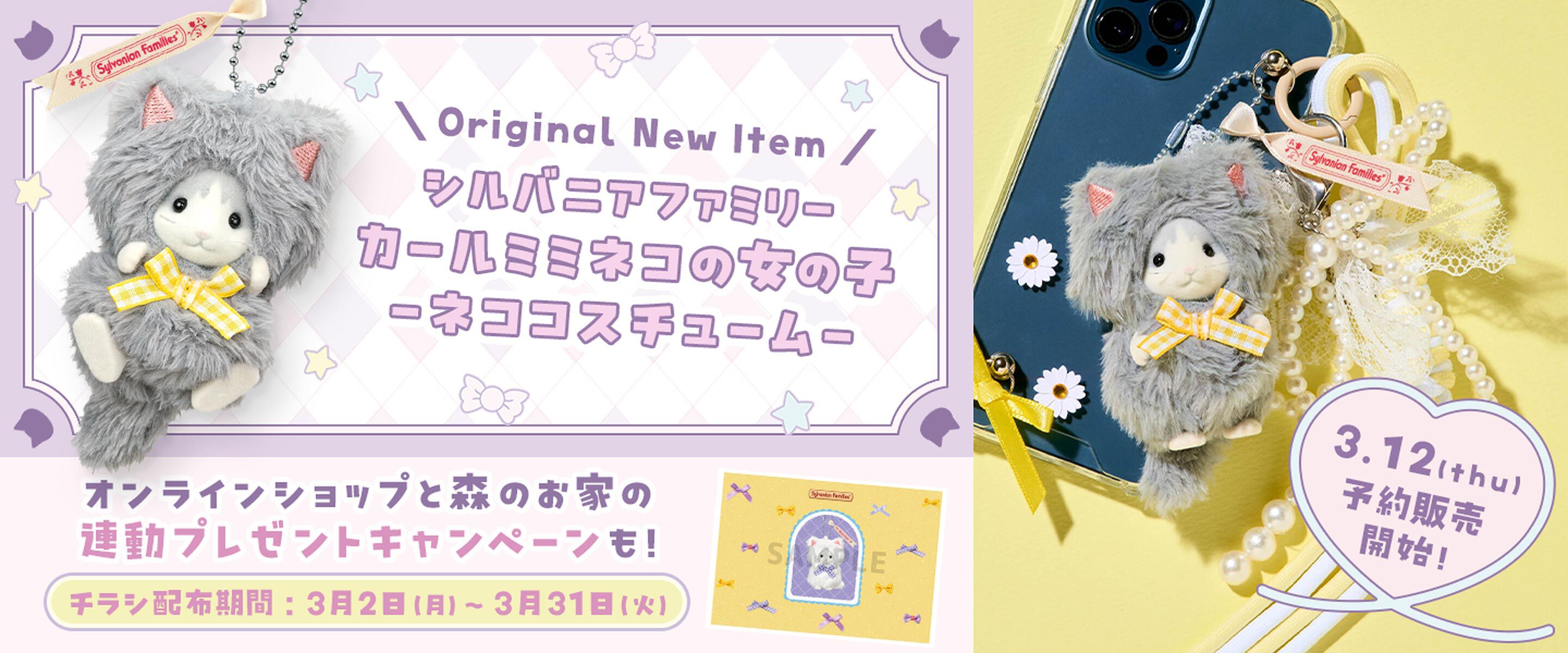 【3/12(木)より予約販売開始】『シルバニアファミリーキーチェーン カールミミネコの女の子-ネココスチューム-』はオンラインオリジナル商品!森のお家との連動キャンペーンも♪