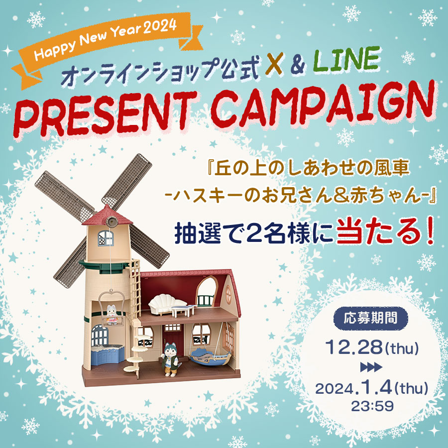 12月28日(木) ~ 2024年1月4日(木)23:59までにシルバニアファミリーオンラインショップ 公式SNS(X(旧Twitter)・LINE)をフォローもしくはお友だち追加し、