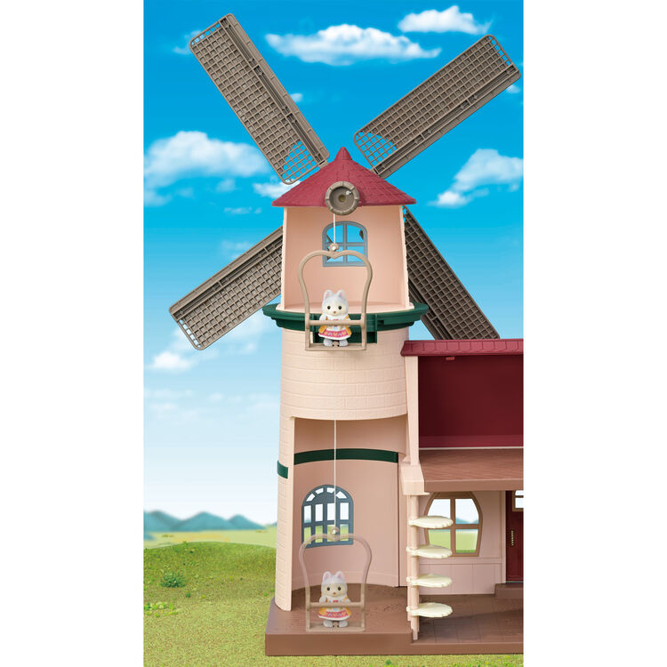 赤い屋根と大きな羽根が特徴の風車小屋は、風車を回すと赤ちゃんが乗れるゴンドラを上下して遊ぶことができます。
