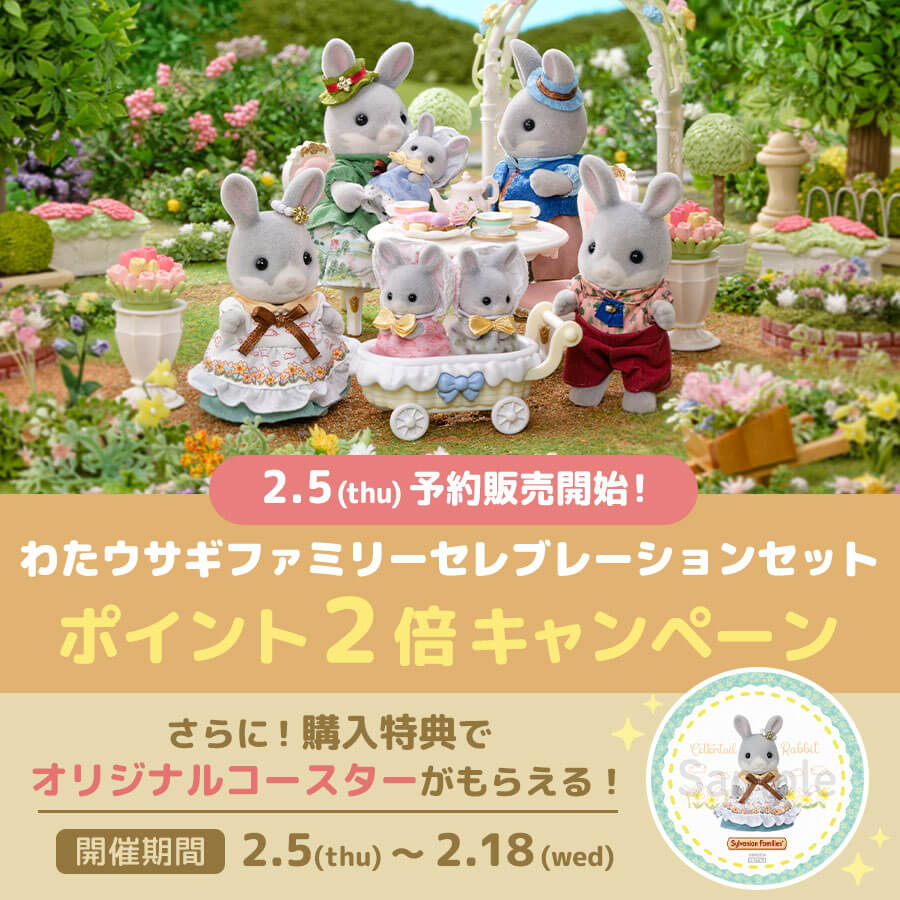 2026年2月14日(土)から発売する新商品『わたウサギファミリー セレブレーションセット』が、シルバニアファミリーオンラインショップで予約販売中!