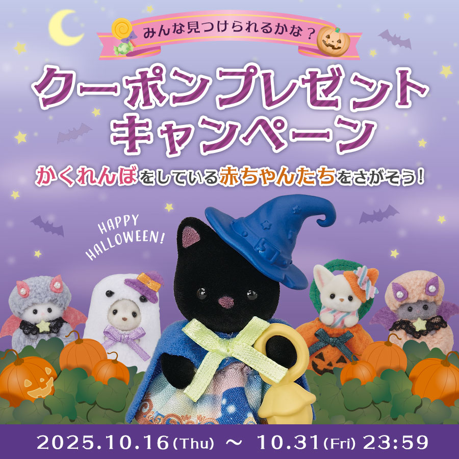 10月16日(木) ~ 10月31日(金)23:59までにシルバニアファミリーオンラインショップのサイト内に隠れているハロウィンの衣装に仮装した赤ちゃんたちを見つけてね!